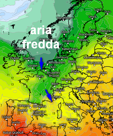 Ecco il calo termico previsto sull’Europa proprio per l’alba di lunedì 19 agosto a 1500m, l’aria in origine fredda ci arriverà fresca:
