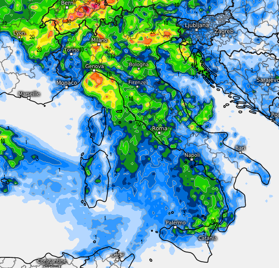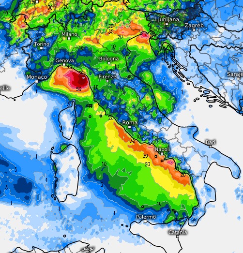 Infine ecco un raffronto con un altro modello che invece evidenzia temporali con pioggia molto abbondante sulla costa della Liguria, dell’alta Toscana e in genere in prossimità delle coste del medio-basso Tirreno e poi sul nord-est: