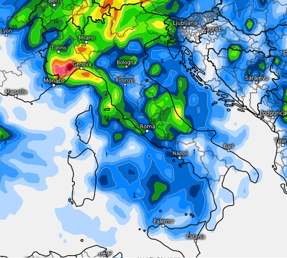 Ad esempio il modello GFS qui sopra prevede un maggior interessamento del nord-ovest, basso Piemonte, Liguria e Milanese, così come del medio Adriatico, che altri modelli evidenziano meno, qui sotto invece la previsione del modello ECMWF, che coinvolge soprattutto Liguria, Lombardia, Veneto e Toscana: