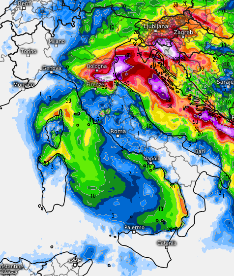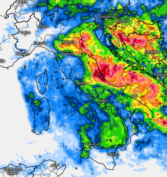 Attenzione però, perché il punto di vista di altri modelli è differente: la disposizione delle correnti con la Bora che interagirebbe con lo Scirocco in risalita dall’Adriatico, andrebbe a favorire fenomeni molto abbondanti, al limite dell’alluvionale, sulla Romagna, piogge da stau colpirebbero il basso Tirreno e qualche temporale raggiungerebbe ancora il nord Sardegna: