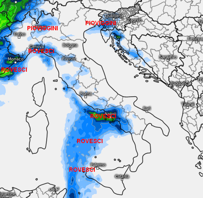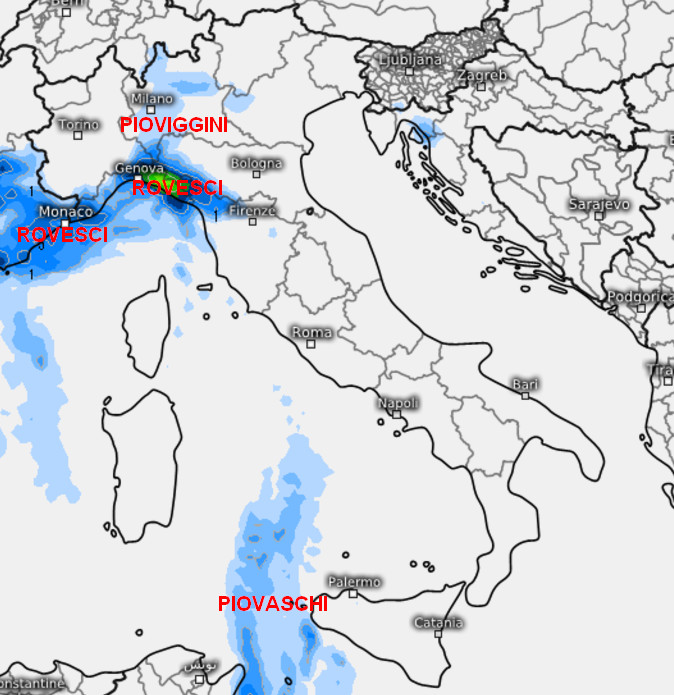 La seconda cartina mostra la sommatoria delle precipitazioni attese in Italia nella giornata di lunedi 25 novembre: