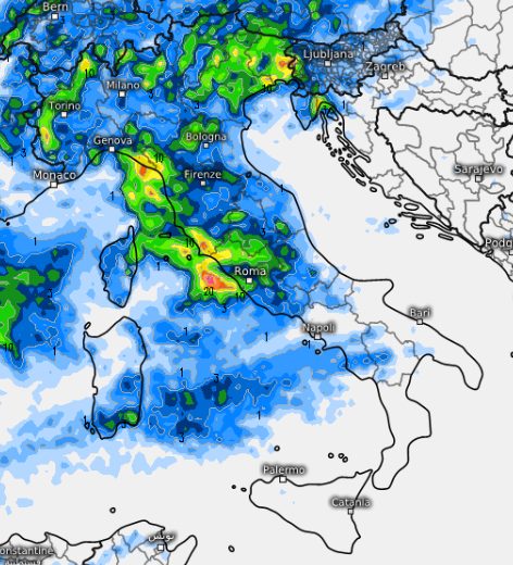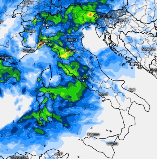 Infatti vede le precipitazioni colpire dapprima il sud della Sardegna, poi localizzarsi maggiormente tra Spezzino, coste della Toscana e sul Lazio, arrivando a colpire in pieno anche la Capitale, con rischio di NUBIFRAGI entro la tarda mattinata. Qualche rovescio possibile anche sulla Campania, più in generale sul settentrione ma con fenomeni più insistenti tra Veneto orientale e Friuli Venezia Giulia.