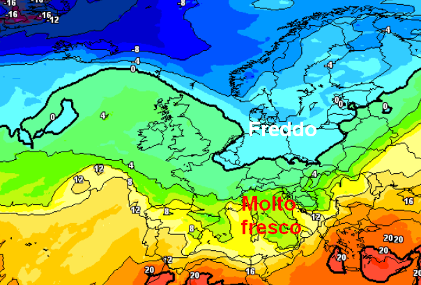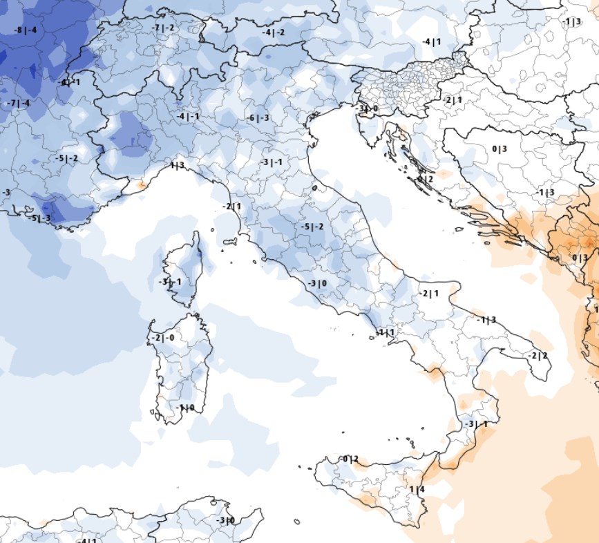 Al nord si va da 1 a 6 gradi in meno rispetto alla norma del periodo, con punte di 8 gradi in meno sulla Pianura Piemontese.