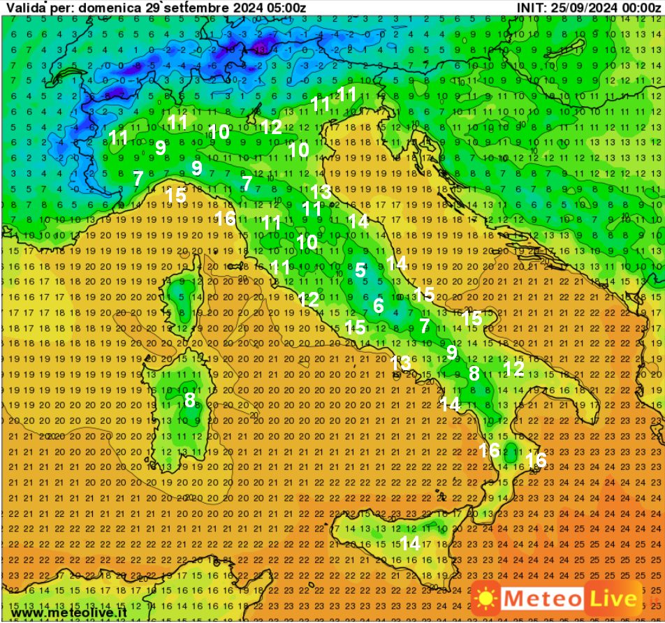 Vediamo adesso il riscontro termico previsto al suolo per la prima mattinata di domenica 29 settembre, attorno alle 7 del mattino: