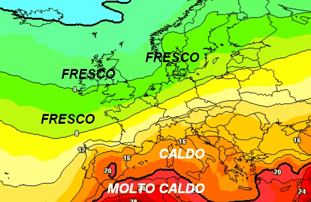 Il fresco verrà spedito a nord delle Alpi. In Italia prenderà piede un caldo moderato, con temperature a 1500 metri comprese tra 15 e 20°. Il caldo intenso e fastidioso, ovvero con valori superiori a 20° alla medesima quota, resterà arroccato sul nord Africa senza intervenire sull’Italia.