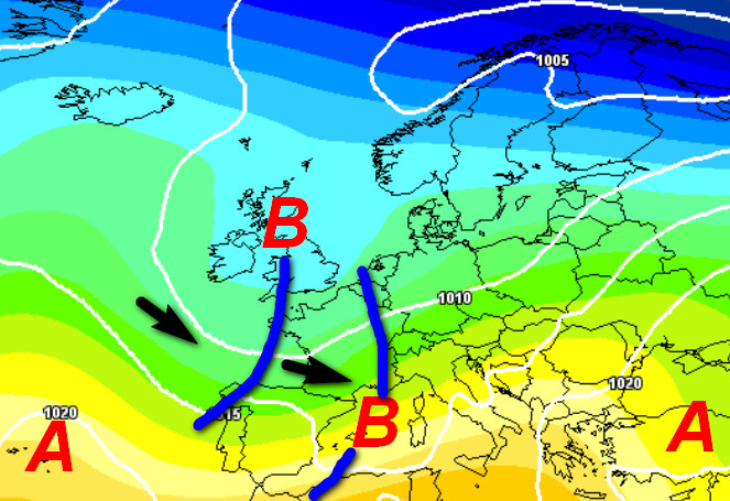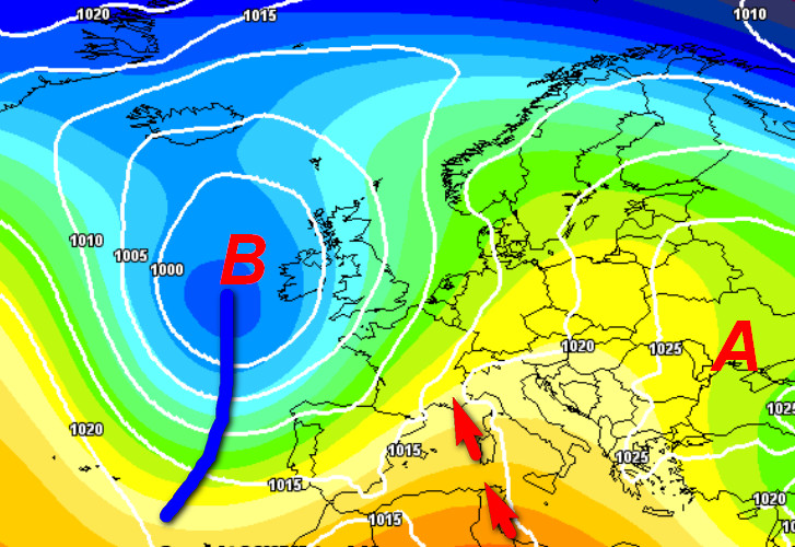 Ecco la depressione con centro poco ad ovest dell’Irlanda in approccio all’Europa centro-occidentale e all’Italia. La presenza di una zona anticiclonica più ad est frenerà l’avanzata della struttura di maltempo verso levante ed attiverà correnti di Scirocco cariche di umidità (frecce rosse); queste apporteranno piogge al nord, sulla Sardegna e sul Tirreno, mentre al sud e lungo il versante adriatico avremo un clima molto mite e nel complesso asciutto.