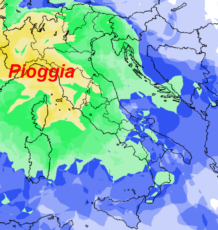 Ecco le piogge al nord e su parte delle regioni centrali dove la probabilità viene giudicata MEDIO-ALTA in corrispondenza del colore giallo sulla cartina. Al sud e sul medio Adriatico, come anticipato, la suddetta probabilità sarà invece BASSA se non del tutto NULLA dove si nota il colore tendente al bianco.