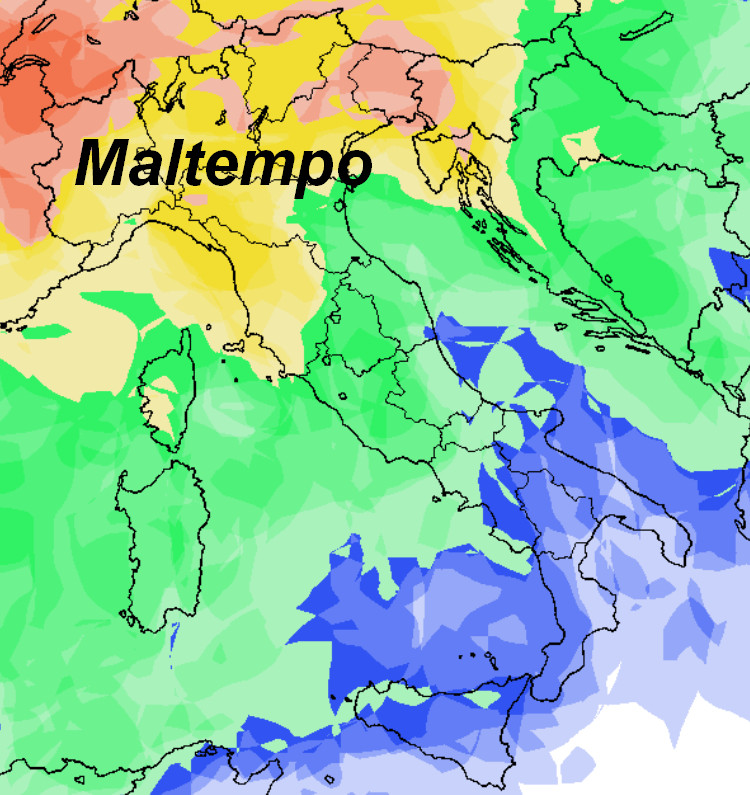 Maltempo al nord e al centro con ELEVATA probabilità di pioggia in corrispondenza del colore rosso sulla mappa. Le regioni meridionali seguiteranno ad avere invece una probabilità di pioggia molto più BASSA ed un tempo decisamente più asciutto.