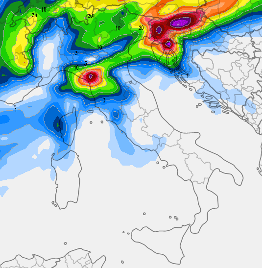 Sabato 25 ottobre: è previsto il passaggio di un nuovo fronte, ma con effetti limitati. I fenomeni saranno circoscritti a Liguria, alta Toscana, parte dell’Emilia, Lombardia e Triveneto, senza coinvolgere il resto del Paese. Si tratta però di una previsione ancora abbozzata, come vedete qui sotto, occorrerà aggiornarsi: