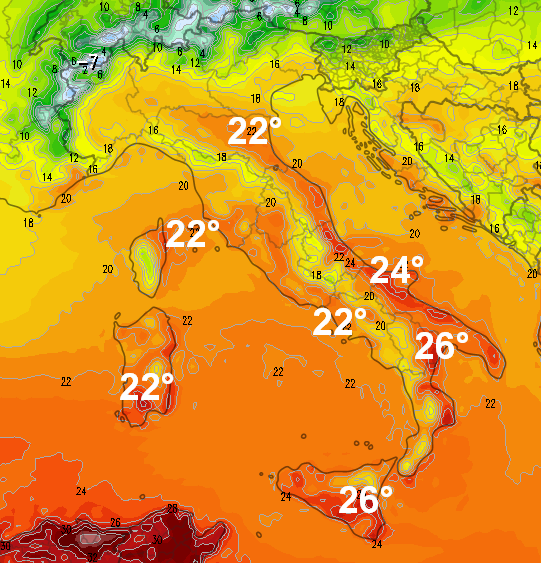 Al Centro-Sud, le temperature in ogni caso subiranno un’impennata, con pomeriggi sorprendentemente miti su Lazio, Campania, Puglia e soprattutto sulle isole maggiori. Ecco le punte massime previste in Italia per ore centrali di venerdì 24 ottobre, notare i picchi d 26°C previsti al sud: