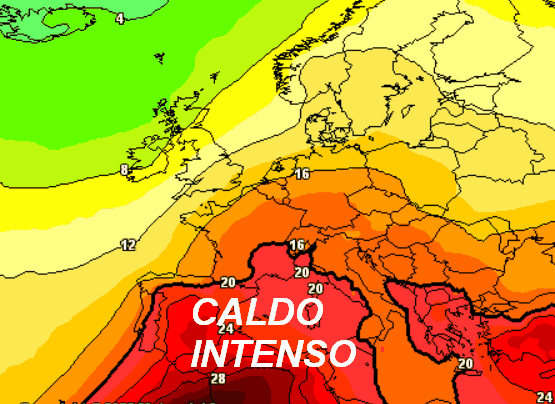 La prima cartina che vi presentiamo offre uno sguardo sulle temperature previste a 1500 metri in Europa nelle ore centrali di domenica 14 luglio.