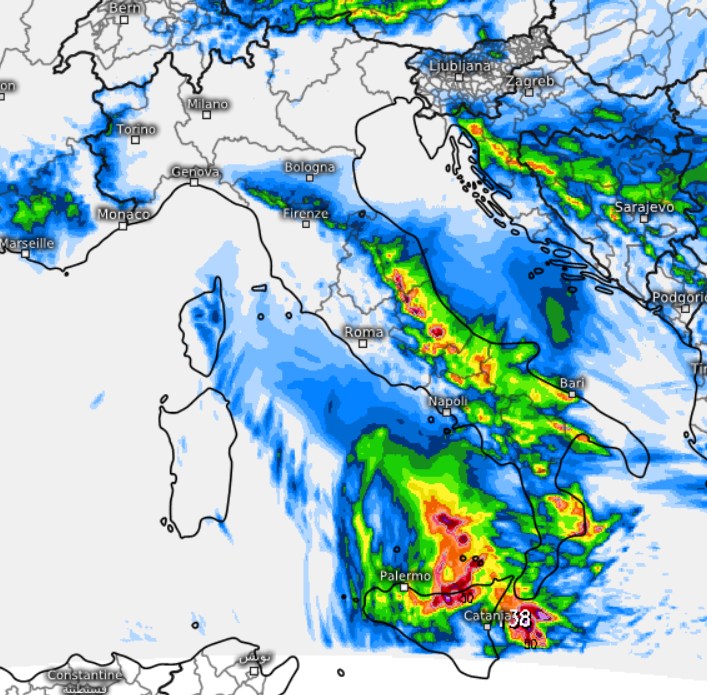 Si notano i rovesci di pioggia (e neve oltre i 1.100-1.200m) su ovest Piemonte nel pomeriggio-sera e rovesci anche su Appennino Tosco-Emiliano, Marche, Abruzzo, Molise, Lucania, rilievi della Campania, nord Puglia, Calabria e Sicilia, addirittura con rischio di nubifragi nel nord Sicilia. Sul medio Adriatico le piogge saranno più probabili e intense sui rilievi.