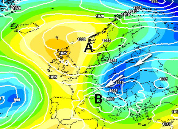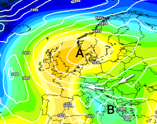 Ecco la mappa barica prevista dal modello GFS per l’alba di martedì 1° aprile, dalla quale si evince chiaramente la disposizione orientale delle correnti sul nostro Paese: