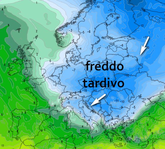 Nel campo termico chi vede il maggior raffreddamento a tutte le quote è però il modello GEM, che addirittura a 1500m sulla verticale della Valpadana e del medio Adriatico pone valori sino a -5°C e soprattutto ritiene che il raffreddamento sia notevole su gran parte dell’Europa centro-orientale, guardate: