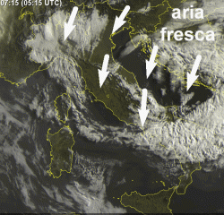 SITUAZIONE: aria fresca affluisce sull’Italia da ENE, in seno al passaggio di una goccia di aria fredda in quota sul meridione, dove non mancheranno rovesci o brevi temporali nel corso della giornata. Coinvolti per effetto stau anche Marche, Abruzzo e parte del nord-ovest. Temperature in generale diminuzione.