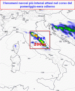 OGGI: al nord passaggi nuvolosi medio alti in un contesto abbastanza soleggiato ma freddo. Sulla Romagna addensamenti e qualche nevicata sino a 100-200m. Al centro perturbato su Marche ed Abruzzo con neve sino a 150-200m, sconfinamenti delle nevicate anche su Casentino, Umbria orientale e Lazio interno. Tempo inaffidabile anche tra Lazio e Sardegna con qualche rovescio possibile, anche temporalesco e grandinigeno nel pomeriggio. Tempo instabile su tutto il sud, ma con schiarite. Annuvolamenti più intensi sulla Campania con possibili rovesci anche grandinigeni e nevicate in Irpinia oltre i 500m. Neve possibile a tratti anche sui rilievi calabresi. Temperature senza grandi variazioni.