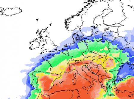Ed è quello che probabilmente ci aspetta almeno sino a metà mese, guardate voi stessi la probabilità che sull’Italia le temperature superino i 15°C a 1500m con questa scala di colori in questa mappa prevista proprio per la metà del mese, il rosso ne esprime la quasi certezza:
