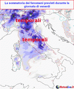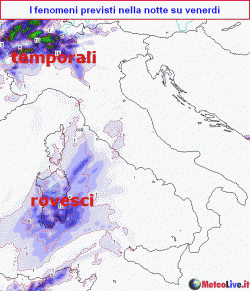 VENERDI: ulteriore sfondamento della saccatura verso levante con diffusa nuvolosità al nord e al centro associata a rovesci e temporali in movimento da ovest verso est, marginale interessamento anche di Campania e Molise, più a sud solo strati nuvolosi medio alti e ancora presenza di caldo moderato all’interno.