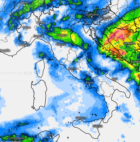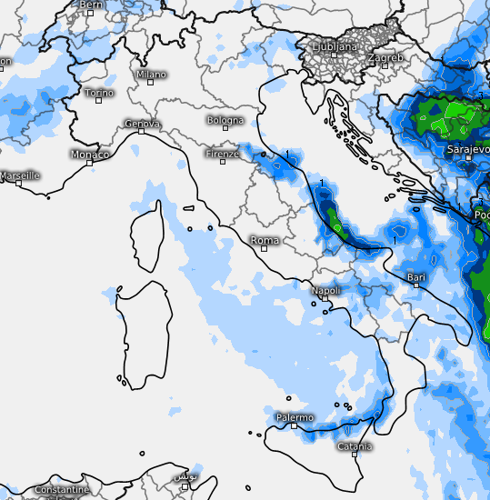 Qualche rovescio passeggero è atteso sul versante tirrenico ma in via di rapido assorbimento. Nel corso di domenica 29 il nucleo temporalesco presente sull’Emilia-Romagna si muoverà verso il medio e basso Adriatico attenuato, qualche rovescio potrebbe impegnare il nord della Sicilia, ma alla fine saranno molto pochi i risvolti precipitativi attesi al centro e al sud, più importanti invece nel campo termico. Vediamo comunque anche qui una mappa ICON per il pomeriggio di domenica 29 settembre: