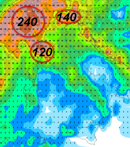 Si prevedono accumuli sin oltre i 230mm da adesso al pomeriggio di lunedì 28 agosto nelle aree che abbiamo cerchiato di rosso del Novarese, Milanese, Vercellese, Verbano, Brianza e di 120mm circa tra Spezzino ed alta Toscana, ma attenzione anche alle punte di 140mm sul Friuli. Se tali accumuli venissero confermati non si escludono locali situazioni alluvionali: