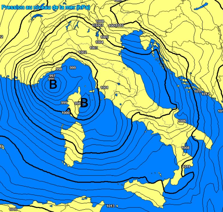 –Le ultime emissioni hanno leggermente ridimensionato i valori di pressione previsti per la tempesta tra Costa Azzurra e Corsica ma un valore di 996hPa resta comunque rilevante, come ben si nota qui sotto per l’alba di giovedì 17 aprile.