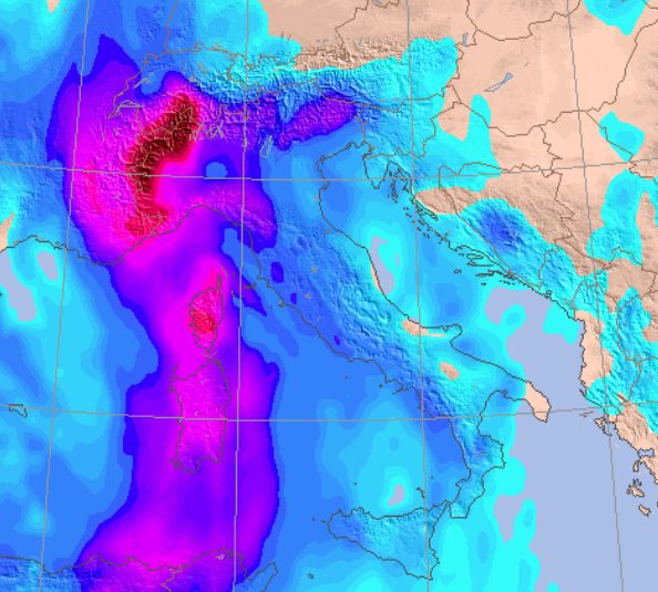 –Il vento di Scirocco andrà ulteriormente intensificandosi nelle prossime ore, andando a raggiungere punte di 100km/h questa notte a ridosso delle coste dell’alto e del medio Adriatico. Da notare il Mistral sulla Costa Azzurra, che virerà da Libeccio tra Sardegna, Corsica, alto e medio Tirreno.