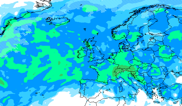 In questo modo le temperature tornerebbero ad abbassarsi, specie al nord con precipitazioni frequenti come vediamo rappresentate in questa mappa:
