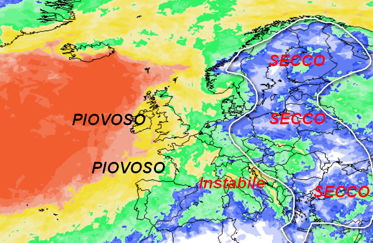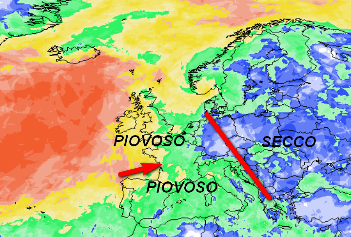 Sulla destra dell’immagine si nota la traccia secca dell’anticiclone, mentre più ad ovest la strada delle miti e piovose correnti occidentali che proverranno a conquistare il Continente. L’Italia sarà nel mezzo ed avrà un tempo piuttosto instabile, con moderato rischio di precipitazioni ed un clima anche abbastanza freddo, ma limitatamente alle regioni del nord.