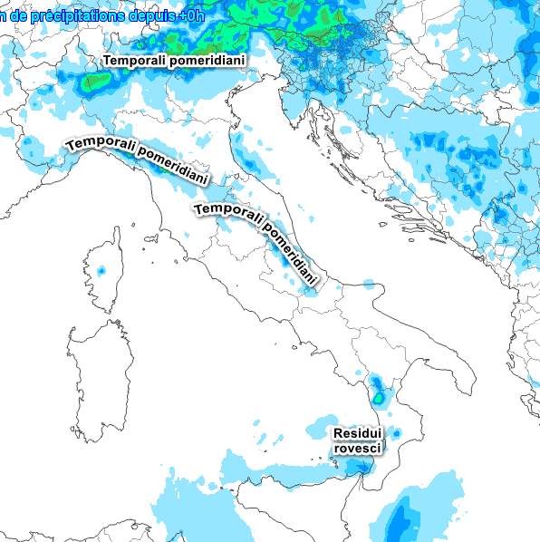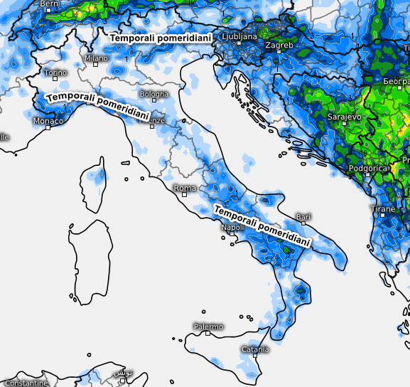 Ancora rischio di temporali pomeridiani sulla fascia alpina e prealpina centro-orientale, l’Appennino Ligure, Tosco-Emiliano e settori interni dell’Italia meridionale, nessun cambiamento sul resto d’Italia.