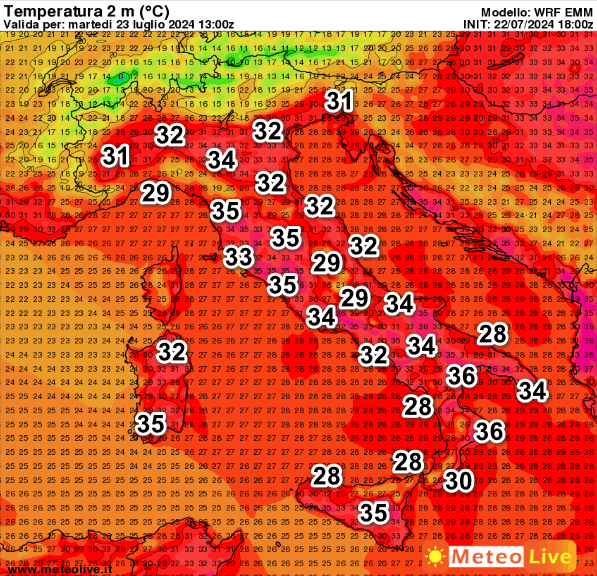 Rispetto alla settimana scorsa, i valori sono comunque calati di qualche punto come era nelle attese. Segnaliamo 36° sulla Calabria Ionica e la Lucania, 35° su Sardegna, Sicilia, Toscana e Lazio. Questo è il DISAGIO da CALDO atteso in Italia.