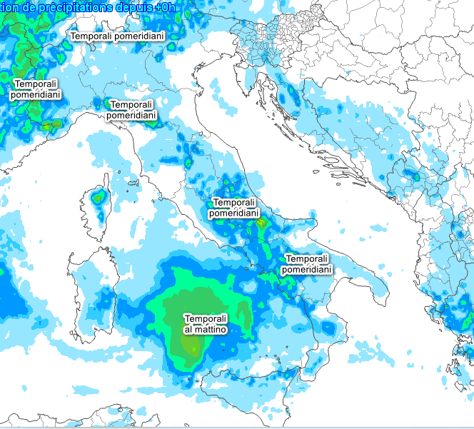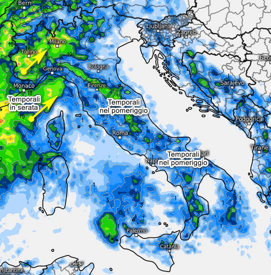 Nelle prossime ore i temporali sul mare perderanno importanza, a scapito delle aree interne e montuose. La seconda mappa mostra la sommatoria delle precipitazioni attese oggi in Italia: