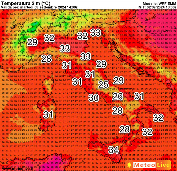 Valori in lieve calo rispetto ai giorni scorsi, ma ancora elevati. Punte di 34° in Sicilia e 33° sulla Pianura Padana orientale. Molte regioni ancora con valori oltre i 30°. Questo è il DISAGIO da CALDO atteso in Italia nella giornata odierna e nei prossimi giorni.