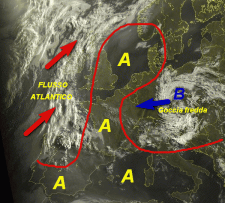 Il collegamento anticiclonico con il quartier generale mediterraneo sta per essere tranciato da una doppia azione: la prima mite e umida proveniente da ovest (flusso atlantico) e la seconda fresca ed instabile legata ad una goccia fredda in moto retrogrado verso occidente (freccia blu).