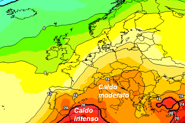 I valori a 1500 metri indicano un caldo moderato, con l’aria più rovente confinata al Nord Africa. Al suolo, però, si potrebbero superare i 30°C in diverse regioni, pur senza raggiungere punte di caldo eccessive.