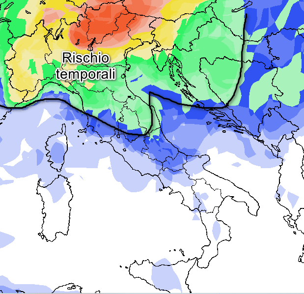 - Bassa probabilità di pioggia (sotto il 25%): indicata in blu, per il restante Centro, il Sud e le Isole.