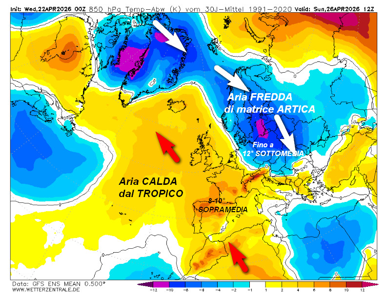 Tra sabato 25 e domenica 26 aprile succederà invece una cosa singolare dal punto di vista termico sul Vecchio Continente. Per fare maggiore chiarezza vi mostriamo la mappa delle anomalie termiche a 1500 metri sul nostro Continente valida per le ore centrali di domenica 26 aprile, secondo la media degli scenari del modello GFS: