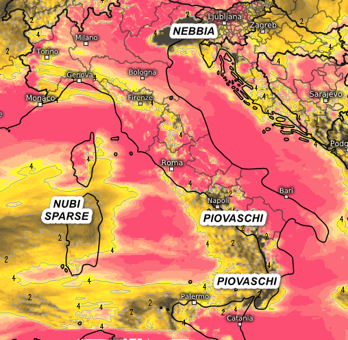 Ancora qualche rovescio tra la Calabria Tirrenica e il nord della Sicilia. Banchi di nebbia sulla Valpadana orientale e nubi sparse sulla Sardegna senza piogge, per il resto soleggiato e molto mite ovunque.