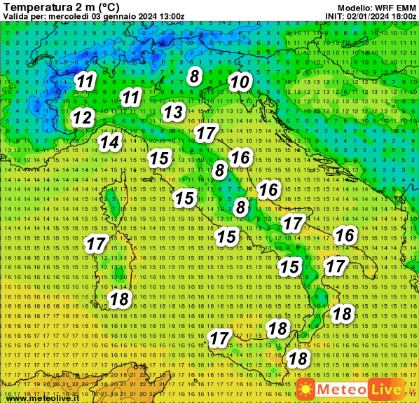 Inverno ancora inesistente sull’Italia. Notiamo punte di 17-18° al sud e sulle Isole, ma quasi tutta la nostra Penisola avrà temperature miti.