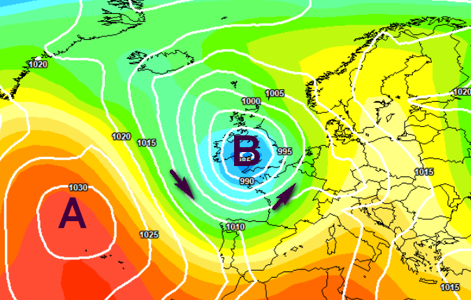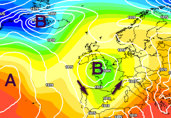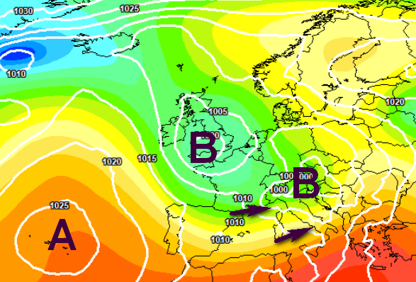 Con il minimo centrato sul Canale della Manica e le forti correnti di Libeccio pioverebbe soprattutto su Toscana, Liguria di Levante, centro-est Lombardia e Triveneto, mentre con la mappa sotto il vortice rimarrebbe guardingo sul Regno Unito, dispensando piogge segnatamente al nord: