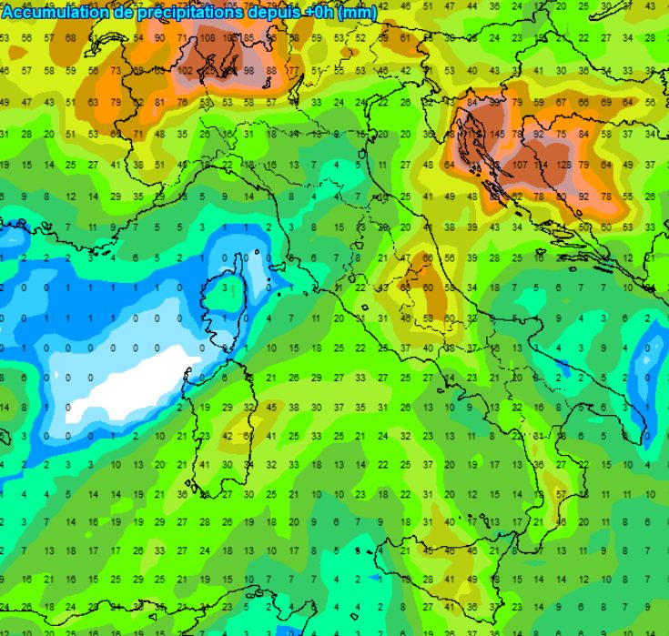Certamente queste mappe relative agli accumuli cambieranno molte volte, in quella qui sopra sembra saltata solo la Corsica e parte della Puglia, ma in realtà il maltempo potrebbe risultare anche molto più intenso o meno a seconda di quanto riuscirà ad affondare verso sud il vortice depressionario.