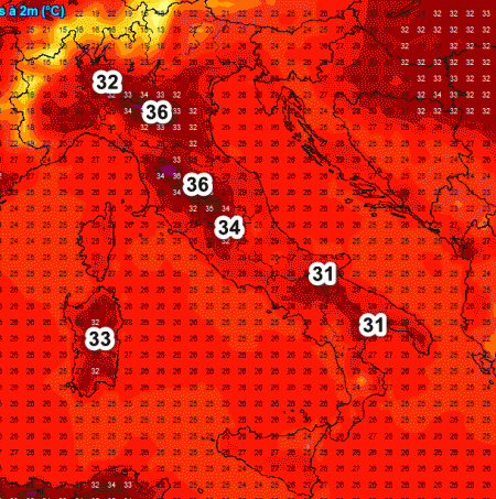 Segnaliamo punte di 36° sull’Emilia Romagna e le aree interne della Toscana, 34° nel Lazio e 33° sulla Sardegna.