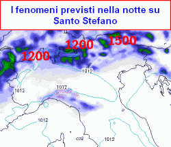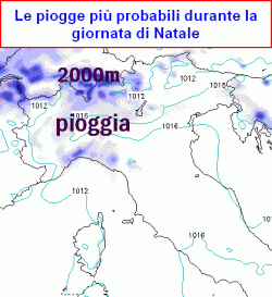 Vigilia con locali pioviggini al nord, nubi anche sul Tirreno, temperature molto miti in quota. Tra Natale e Santo Stefano qualche precipitazione al nord e sul Tirreno, specie sulle Alpi, dove la quota neve si abbasserà da 2000 a 1200m. Pausa di riflessione dell'inverno, sia a causa delle correnti miti in arrivo dall'Atlantico, sia per la consueta ingombrante presenza dell'anticiclone africano, dal quale non ci libereremo troppo facilmente.