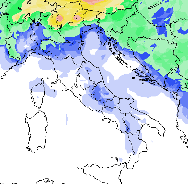 Qui, i colori sulle mappe passano dal verde medio-basso (25-50% di probabilità) al giallo medio-alto (50-75%), fino al rosso (oltre il 75%), indicando una probabilità elevata di rovesci. Sul resto d’Italia, invece, la probabilità di precipitazioni si presenterà generalmente bassa, se non del tutto nulla, con ampie zone contrassegnate dal bianco, sinonimo di tempo stabile e asciutto. Questo conferma la tipica configurazione estiva, con l’instabilità che si concentra sui rilievi settentrionali a causa di infiltrazioni instabili provenienti dall’Atlantico.