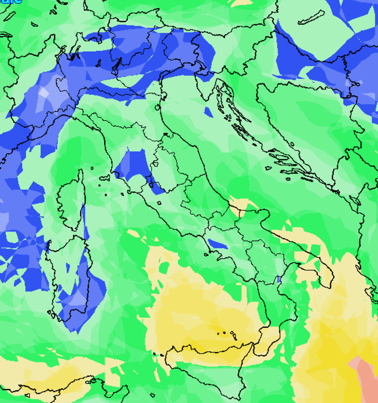 A parte alcune aree del settentrione, della Toscana e della Sardegna dove la probabilità di pioggia resterà BASSA, sul resto d’Italia avremo una probabilità MEDIA o MEDIO-ALTA di veder cadere acqua dal cielo, se non addirittura neve sull’Appennino, compatibilmente con le temperature che ci saranno.
