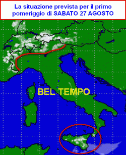 Le previsioni per la giornata odierna, sabato 27 agosto, sono molto semplici e le vediamo raffigurate nella mappa.