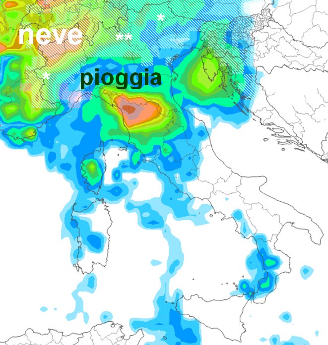 Si nota l’avvezione calda su tutte le basse pianure e l’Appennino ligure, che impedirà la caduta di neve.