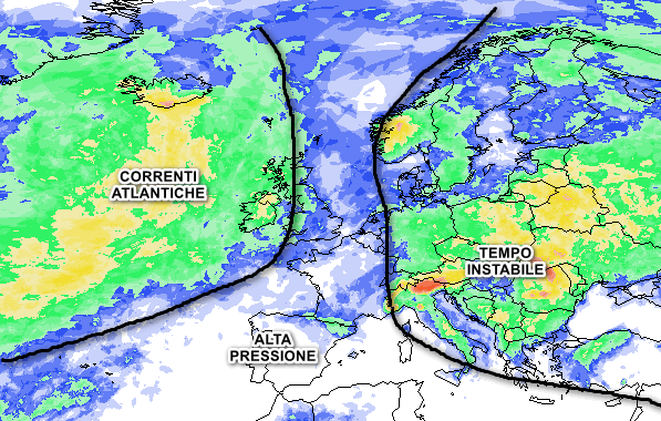 Per illustrare meglio questa tendenza, è utile osservare la mappa della probabilità di pioggia a scala europea, valida per le ore centrali di venerdì 18 luglio.