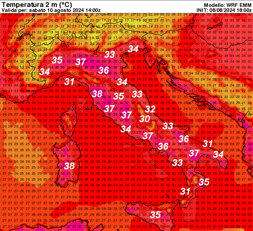 Infine, queste sono le temperature attese in Italia alle ore 16 di sabato 10 agosto (possiamo omettere la mappa dei fenomeni perchè sarà praticamente tutto sereno da nord a sud).