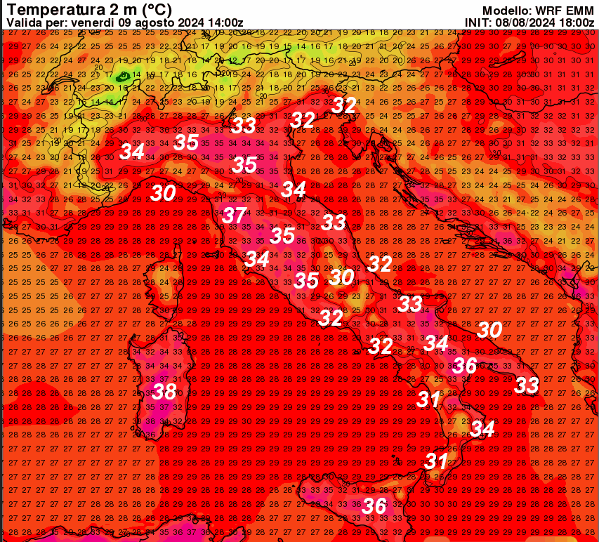 Punte di 38° in Sardegna, 37° nelle aree interne della Toscana, 36° su Lucania e Sicilia.