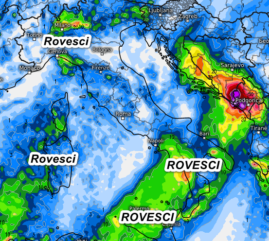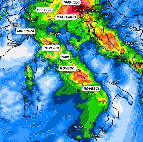 Il maltempo con rovesci anche intensi e temporali si concentrerà soprattutto al nord-est, sul Tirreno e tutte le aree interne. Quota neve in calo sulle Alpi fino a 800-1000 metri in chiusura di passaggio. Più sporadici i fenomeni lungo il versante adriatico ed al sud ad eccezione di Campania e Calabria Tirrenica che avranno acquazzoni anche forti. Attenzione ai venti forti di Ostro, tendenti a piegare da Maestrale sulla Sardegna con mari in condizioni non ottimali.